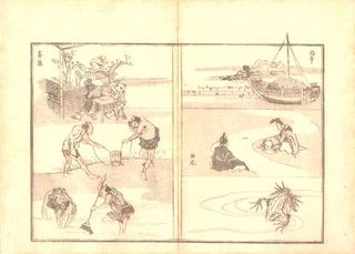 Hokusai Ouvriers, élégantes, musicien Estampe originale de 1850 HA77 Page