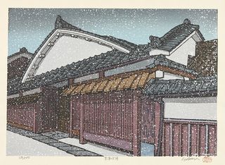 Auberge à Kusatsu Estampe originale du dernier quart du 20ème siècle Signée et titrée au crayon de la main de l'artiste Numérotée 108 / 500 par l'artiste Page Maîtres du Shin hanga ou page La neige en estampes |
