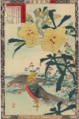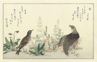 (1752 - 1815) Série " un chur d'oiseaux " (momo chidori kyoka awase) Une alouette et deux cailles Réédition vers 1970 Editeur Adachi (sceau au dos) Vendue avril 2014 Format oban : 40,5 cm x 26,1 cm (UT02) Cliquer sur l'image pour détailler et agrandir |