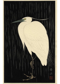 Gakusui IDE Héron sous la pluie, 1947 Gaufrage sur les plumes Epuisée - Sold out Format oban : 39,5 cm x 26 cm (IG03) Cliquer sur l'image pour voir un agrandissement en haute définition de cette estampe |