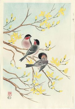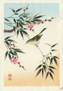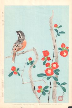 Bruant des prairies et cognassiers du Japon Estampe originale vers 1960 Editeur Matsukichi Graveur Okura, imprimeur Shinmi Vendue juillet 2015 Format oban : 40 cm x 26,5 cm (NS03) Cliquer sur l'image pour détailler et agrandir |