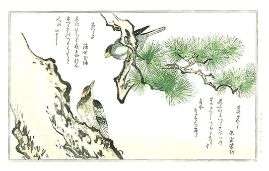 Utamaro (1752 - 1815) Série " un chur d'oiseaux " (Momo chidori kyoka awase) Oiseaux et branche de pin Réédition 1960-1970 - Editeur Yuyudo Graveur Kentaro MAEDA, Imprimeur Taro ITO Vendue février 2019 Format oban : 40,6 cm x 26,8 cm (VL13) Cliquer sur l'image pour documenter et agrandir |